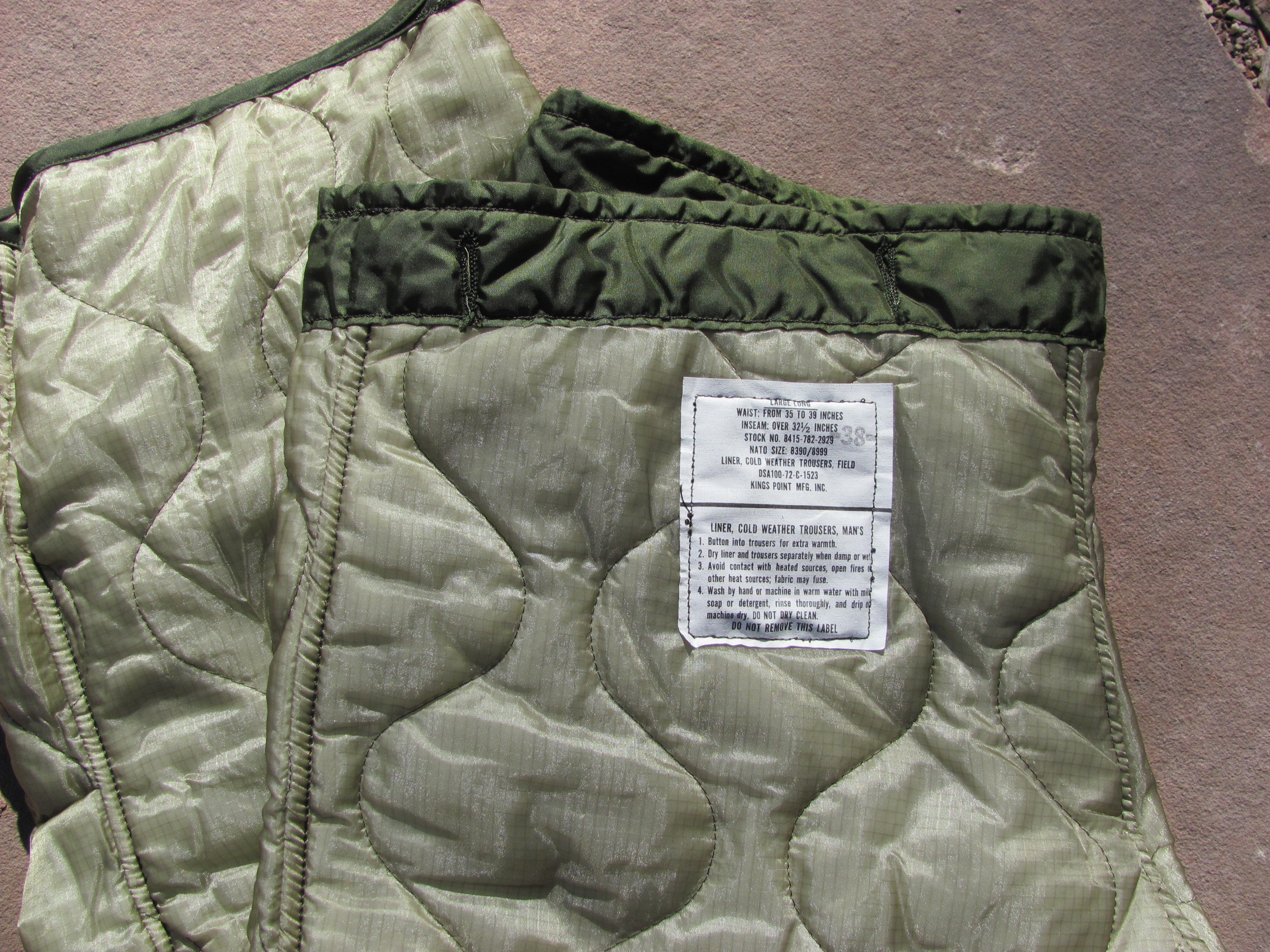 Quilted field pant liners. Buttons into field pants to make them a lot warmer. Nice item to have for winter conditions.