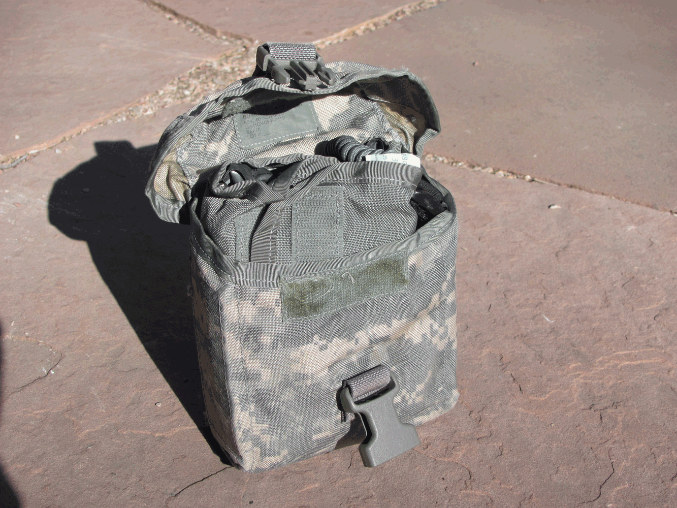 Individual First Aid Kit is filled with various medical gear, as issued. Current issue with inner carrier and ACU carrying case. MOLLE attachment system.