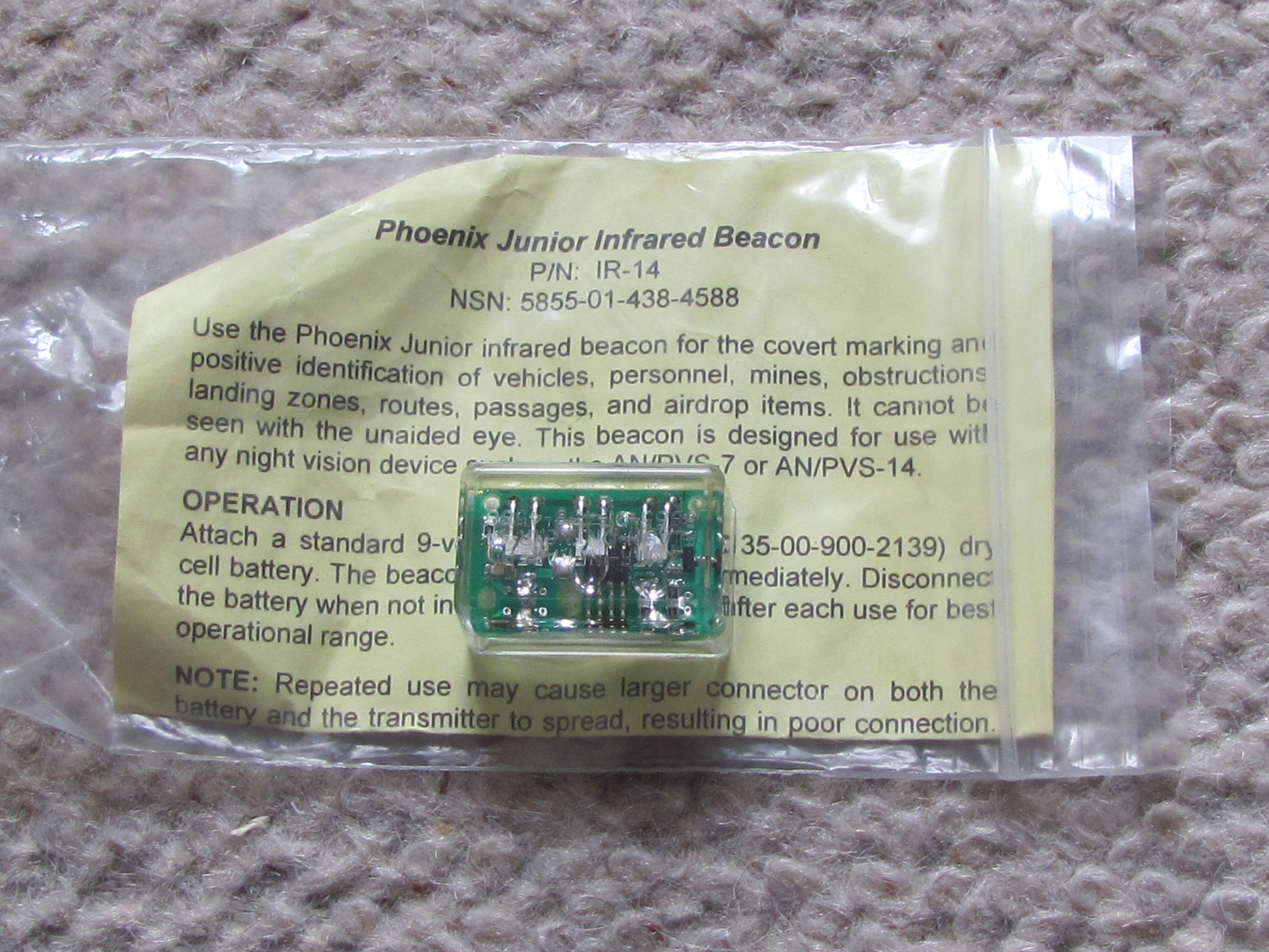 IR beacon. Super small, weighs almost nothing. Uses a standard 9V battery. These were issued to soldiers in combat environments. In case of separation from unit at night, one could easily be found using night vision goggles. It strobes brightly but can only be seen by those with night vision devices. New.