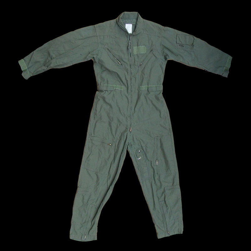 Many zippered pockets, one piece suit. Fire retardant nomex construction. Usually OD green but Desert tan ones are sometimes available as well.